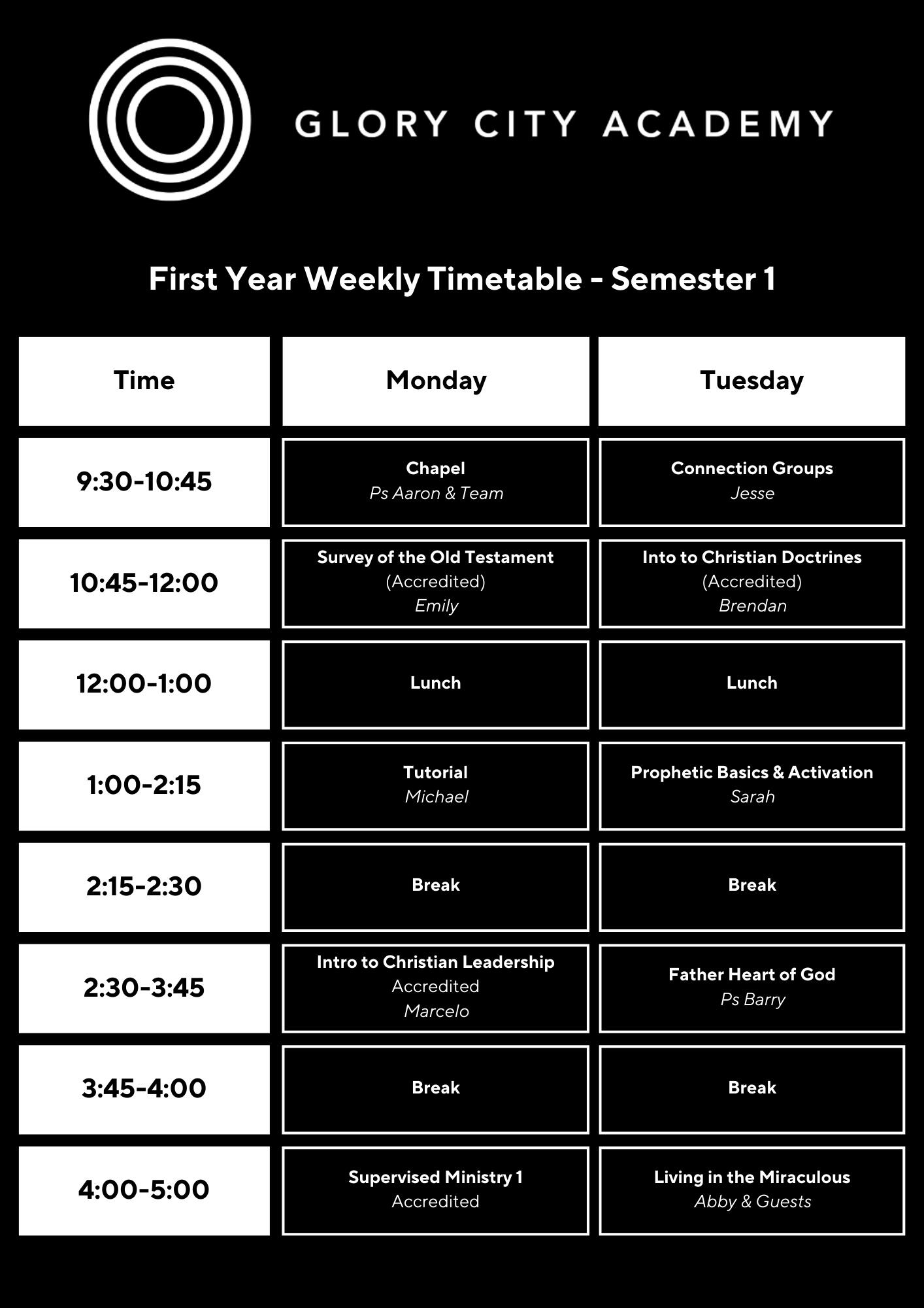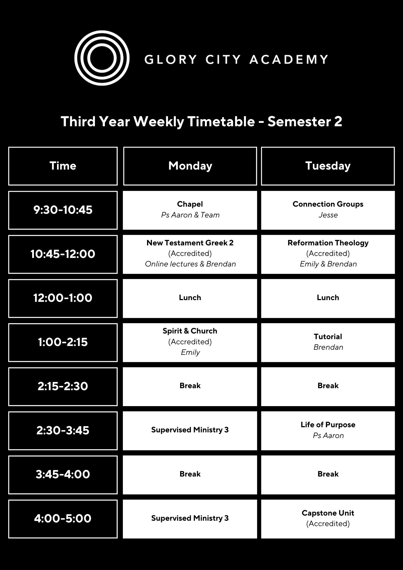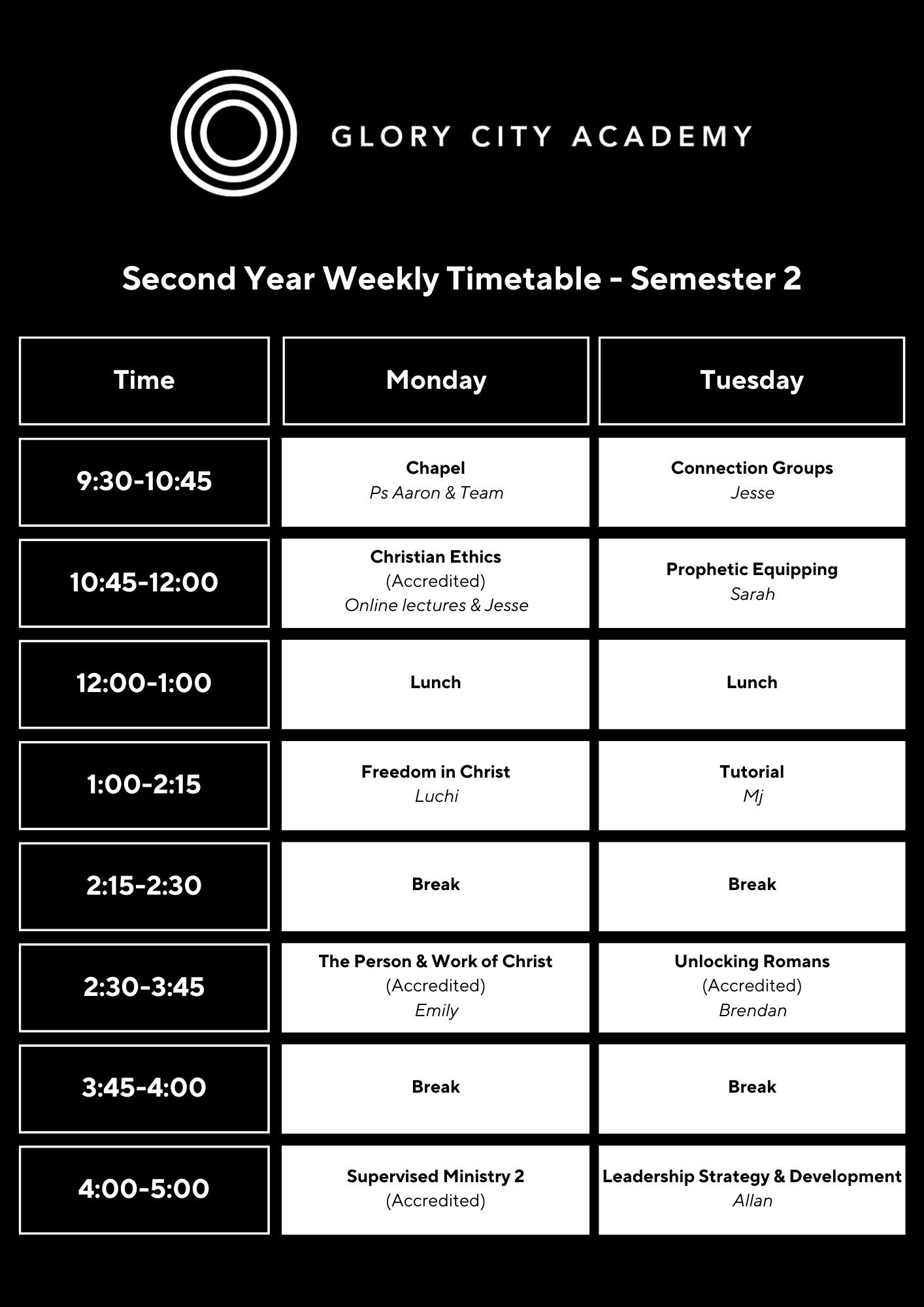 This course equips students to step confidently into life beyond Glory City Academy, prepared to pursue their God-given calling in any sphere—whether in ministry, the workplace, or wider society. Through biblical teaching, personal formation, and practical tools, students will learn how to live with clarity, resilience, and vision. The focus is on developing character, confidence, and wisdom so that graduates are equipped to make a meaningful impact in the field to which God has called them.