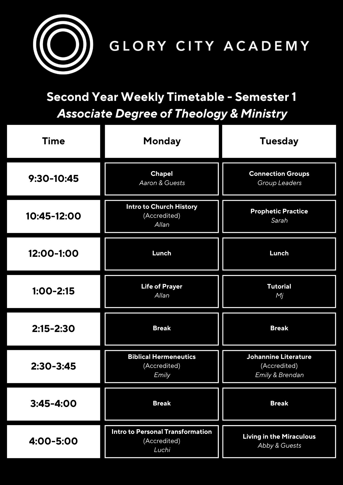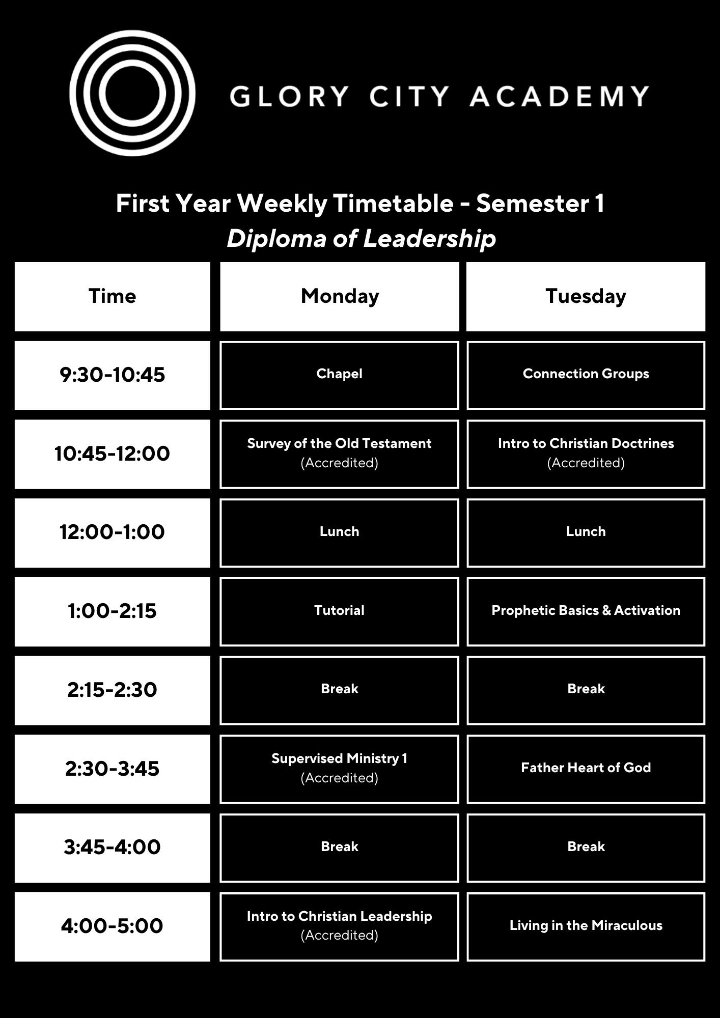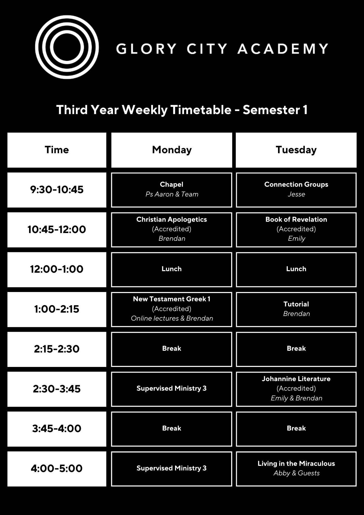 This course equips students to step confidently into life beyond Glory City Academy, prepared to pursue their God-given calling in any sphere—whether in ministry, the workplace, or wider society. Through biblical teaching, personal formation, and practical tools, students will learn how to live with clarity, resilience, and vision. The focus is on developing character, confidence, and wisdom so that graduates are equipped to make a meaningful impact in the field to which God has called them.