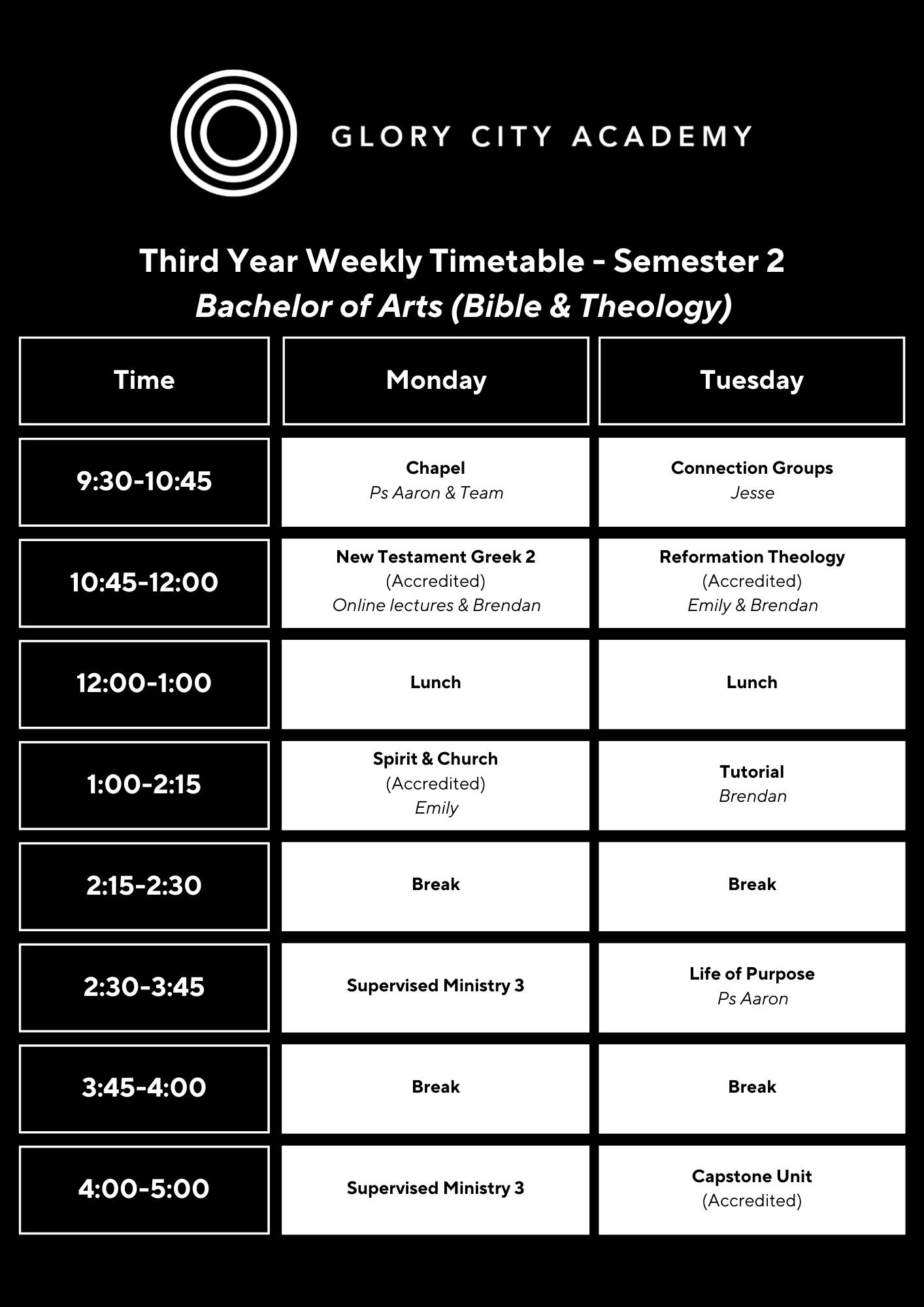 This course equips students to step confidently into life beyond Glory City Academy, prepared to pursue their God-given calling in any sphere—whether in ministry, the workplace, or wider society. Through biblical teaching, personal formation, and practical tools, students will learn how to live with clarity, resilience, and vision. The focus is on developing character, confidence, and wisdom so that graduates are equipped to make a meaningful impact in the field to which God has called them.